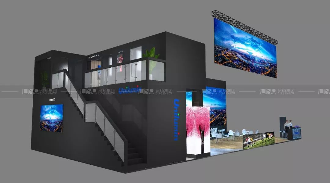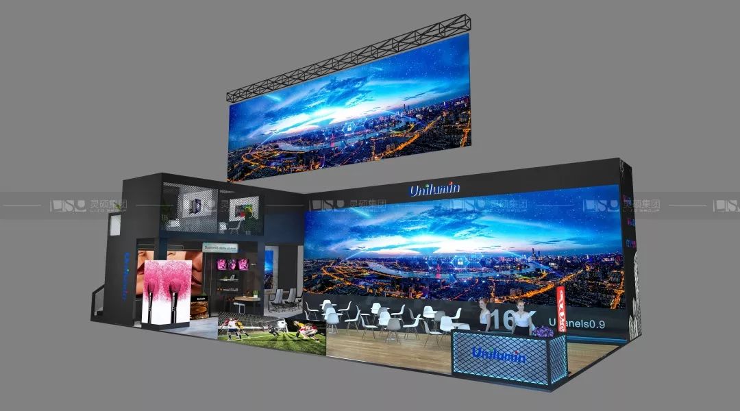 靈碩設計團隊在前期深入研究了洲明科技的品牌及產品,終以時尚黑為主基調,為展臺奠定了高級感、國際感。